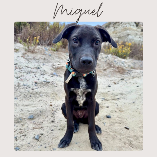 He’s crate trained and sleeps through the night like a champ. Miguel is also working hard on his potty training, learning basic commands, and picking up his puppy manners. He’s smart, eager, and always aiming to please!