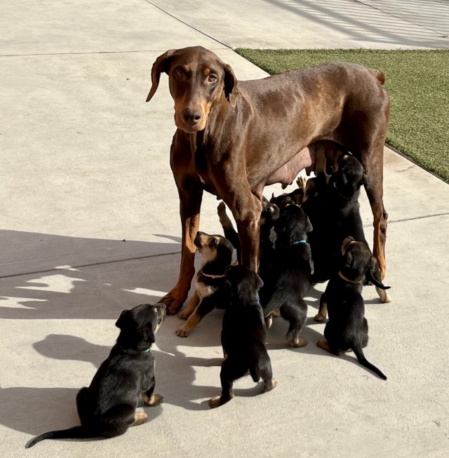 Meet the Charcuterie Litter! These adorable Doberman Pinscher mix puppies (some boys and some girls) are just about 8 weeks old and already stealing hearts.