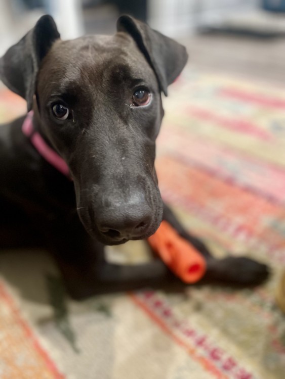 Dottie is a beautiful 2-year-old Doberman mix with a shiny black coat, a playful spirit, and a heart full of love.