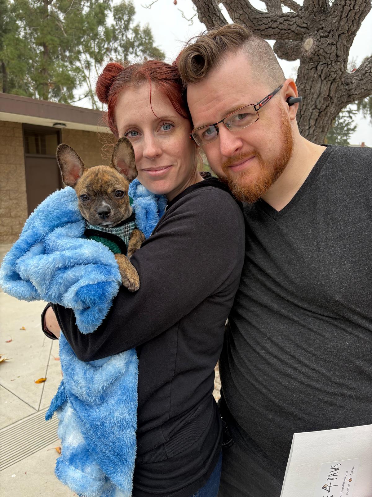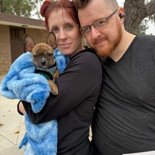 This beautiful brindle boy is full of playful puppy energy and loves everyone he meets — dogs, cats, and kids alike. He’s curious, cheerful, and always ready for fun, whether it’s playing with toys or snuggling up for a nap after.