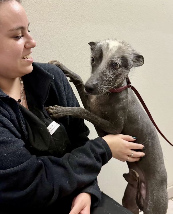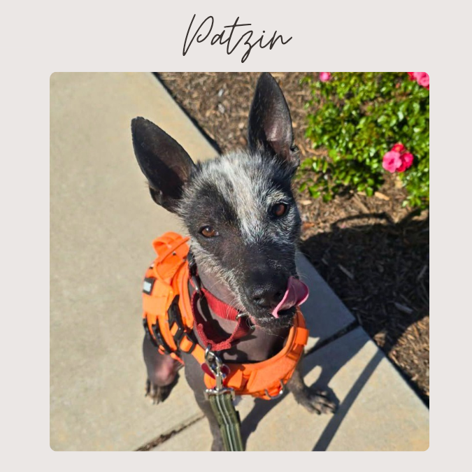 Patzin is an 11-month-old Xoloitzcuintli (Mexican Hairless), a rare and ancient breed known for their deep loyalty and sensitivity. At around 25 lbs, he’s the perfect medium size and still very much a puppy learning about the world.