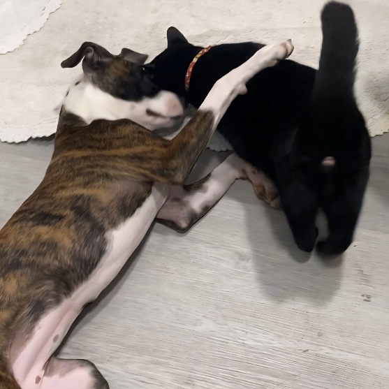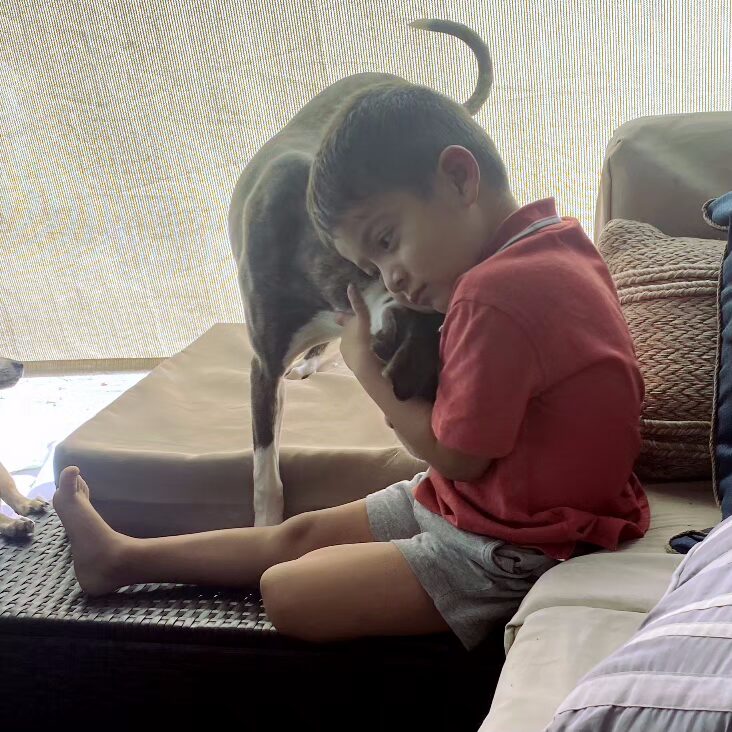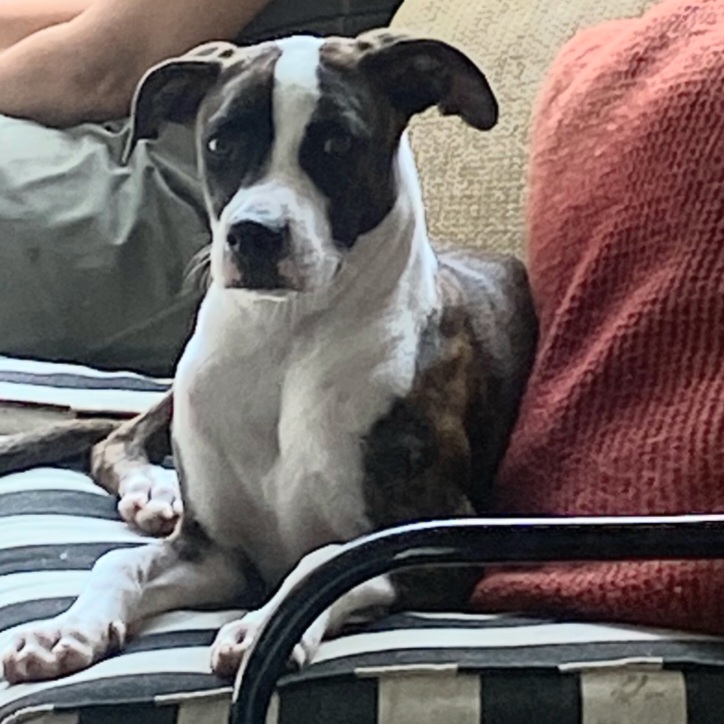 Tina is as sweet as she is stunning — a brindle and white beauty who wins everyone over with her gentle, loving nature. She’s great with people of all ages, adores young kids, and gets along wonderfully with cats and small dogs.